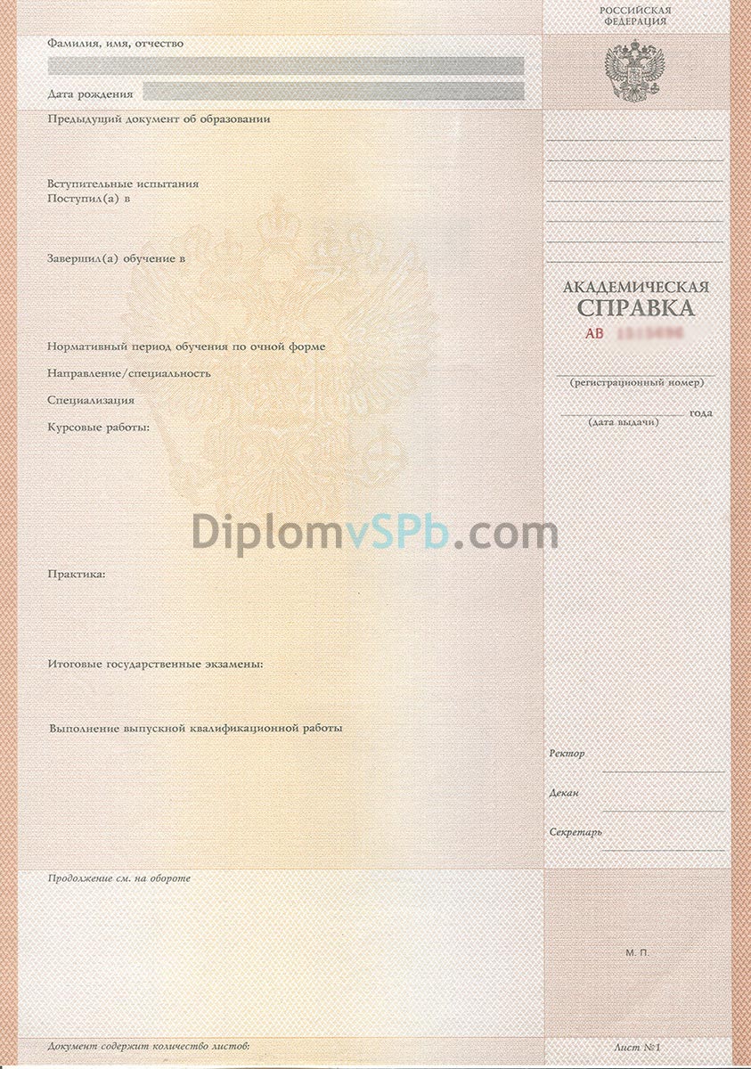 На нашем сайте Вы можете купить академическую справку государственного образца, заполненный по стандартам выбранного ВУЗа и всем государственным требованиям. Образец и стоимость справки представлена ниже. Для заказа выберите ВУЗ, специальность, год поступления и отчисления, сообщите нам свои данные и уже через 1 день Вы получите свой документ. Доставка по Санкт-Петербургу бесплатна и без предоплаты