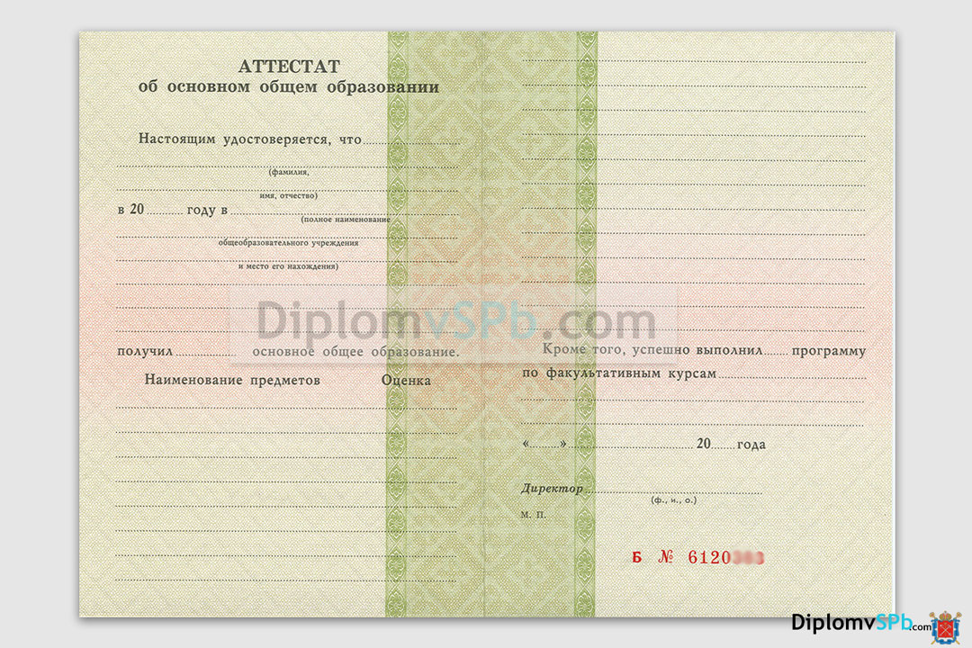 Данные, необходимые для заказа аттестата за 9 класс: ФИО выпускника, дата и место рождения, год окончания учебы, город и школа, оценки по предметам (по желанию), ФИО директора (если знаете). Наши аттестаты заполняются по стандартам Минобрнауки РФ. Можем сделать точную копию по Вашему образцу
