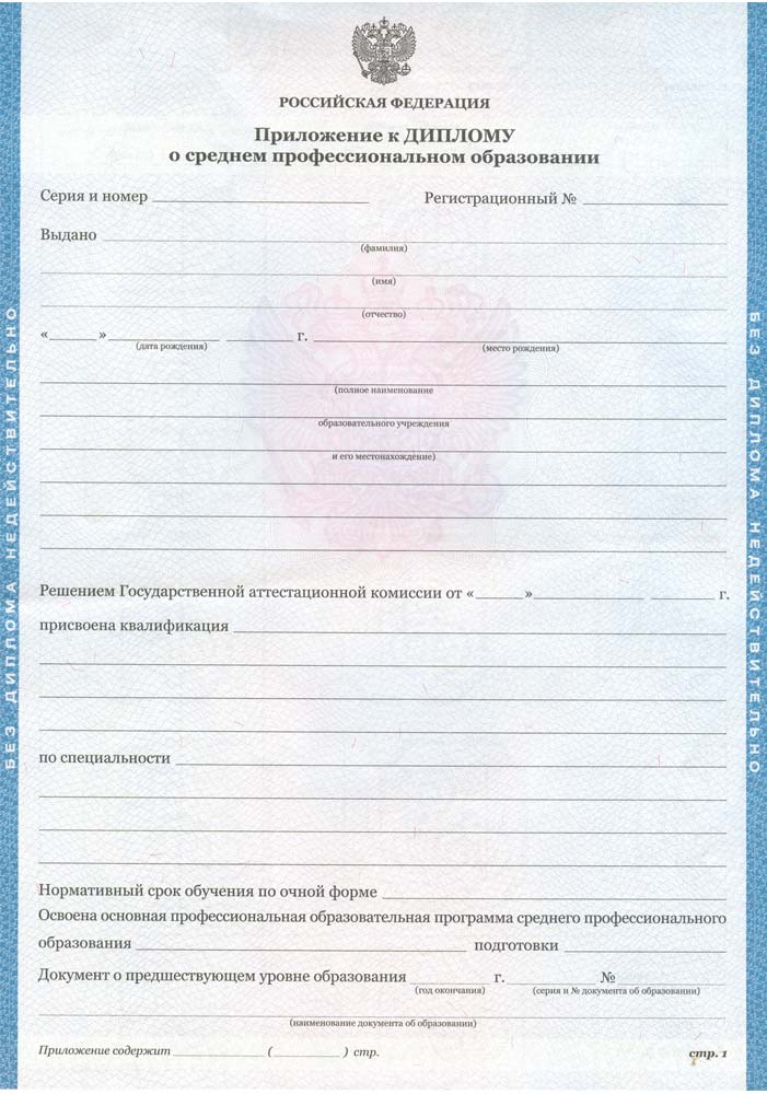 Приложение к диплому о среднем образовании до 2013 года. Заполняется по стандартам выбранного техникума или колледжа, государственным требованиям, а также Вашим пожеланиям. Заверяется гербовой печатью учебного заведения и всем подписями.